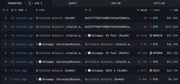 Ethereum co-founder Vitalik Buterin sold On the Uniswap decentralized exchange, several different memcoins, including DOJO, SPURDO and MARVIN, bought 22.14 ETH with a total value of about $96,400. The transactions were noticed by Lookonchain analysts.